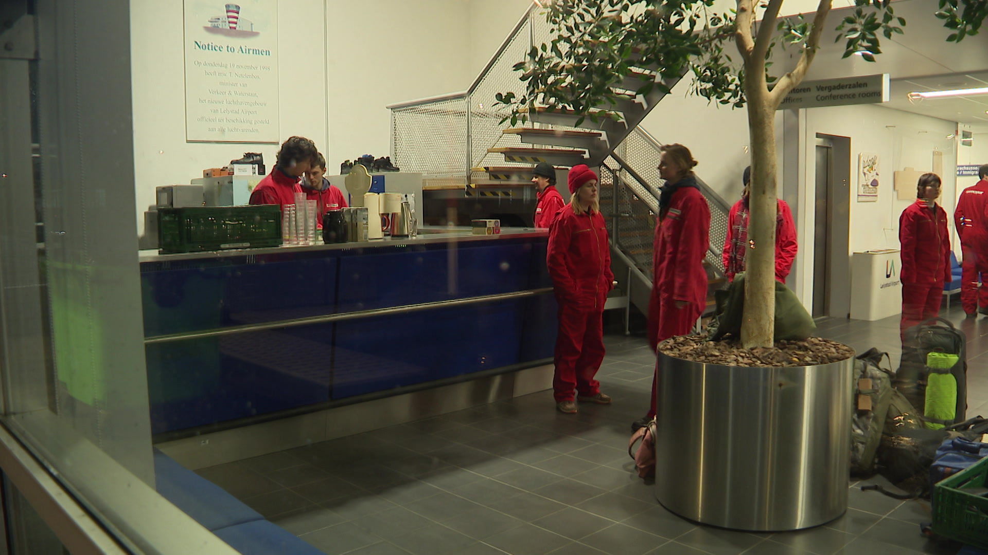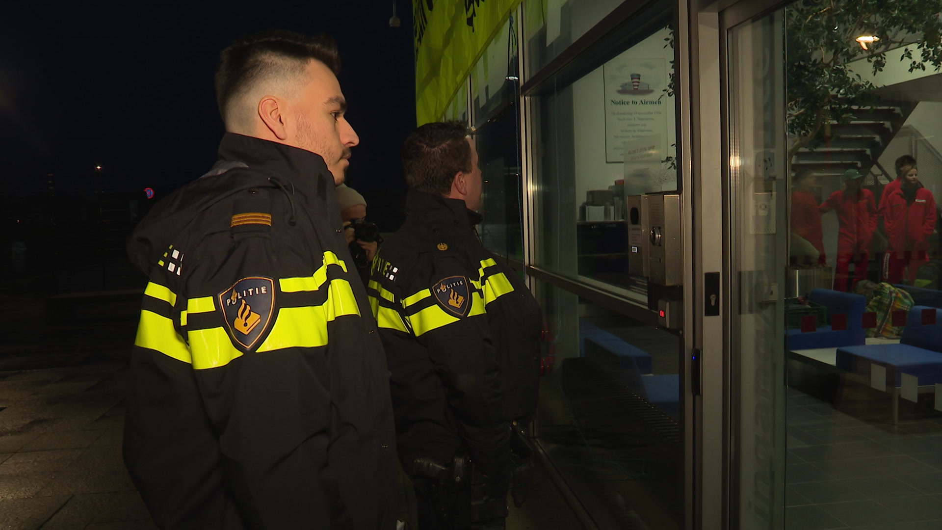 Bij een zij-ingang van het hoofdkantoor zitten twee politieagenten. De buitendeur kan daar open. Maar de tweede deur naar de vertrekhal is gebarricadeerd. De agenten zitten als het ware in een kleine hal. "We hebben goed contact met ze", zegt Van Meurs. "We hebben ze zelfs eten aangeboden."