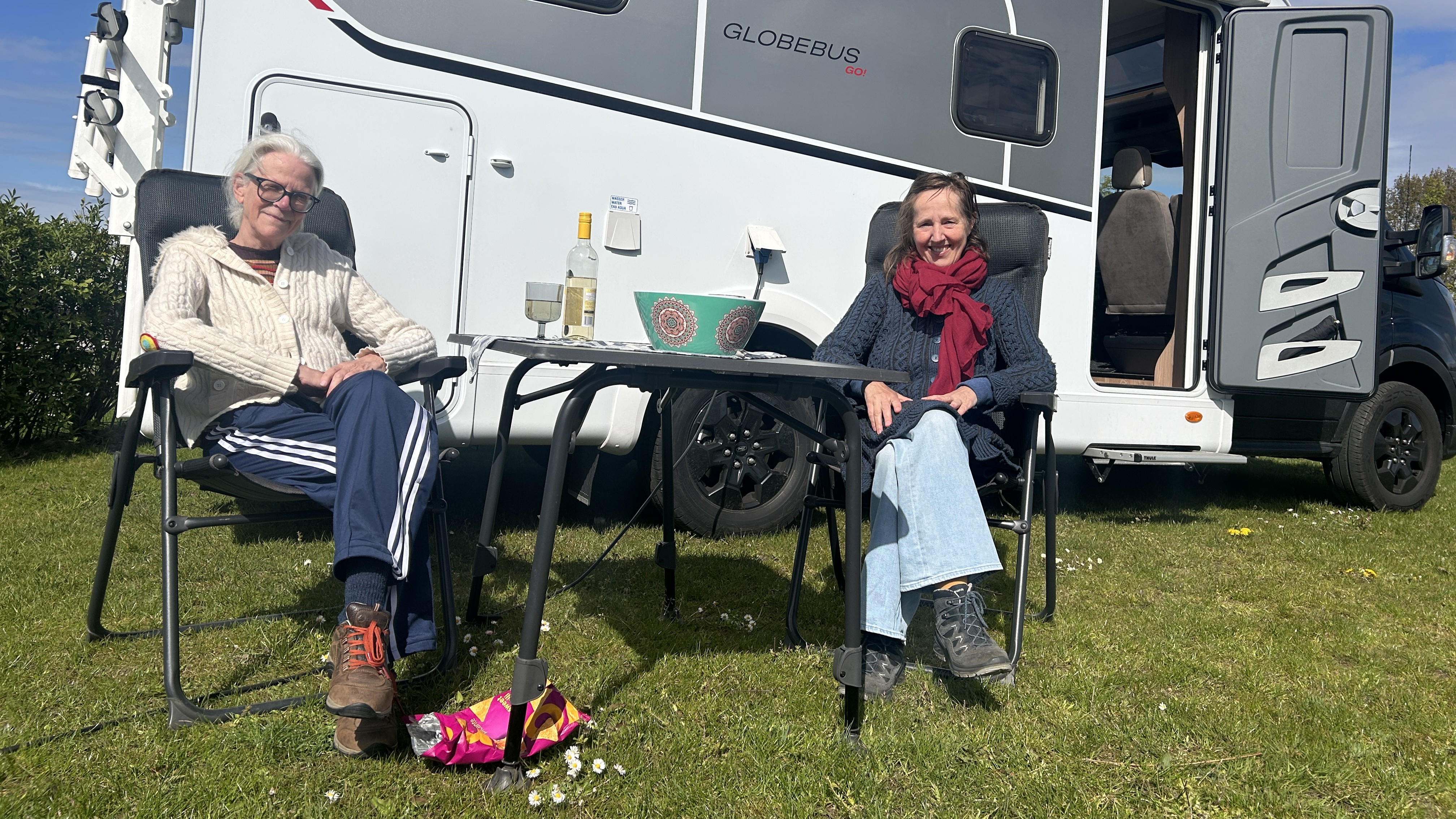 De kampeersters zijn collega’s; allebei coach bij CliniClowns. "We praten veel over werk. Maar dat is ook leuk", zegt Trudie. Ondertussen vouwt ze wat onwennig een plastic campingtafel uit. Eén wielpootje klapt eigenwijs dubbel en het andere wieltje rolt los naast de camper. "Alles is nieuw en we doen alles voor het eerst", zegt Trudie.