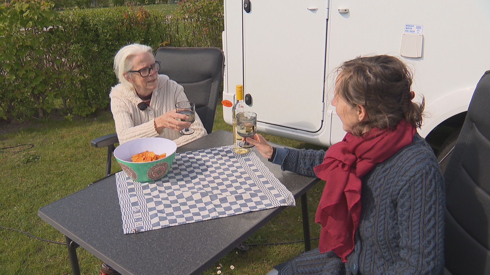 Verderop zitten Trudie en Margreet inmiddels aan de witte wijn. Voor het eerst in de hele vakantie mag er een zak chips open. "We hebben de hele week niet gechipst", roept Margreet. Ze proosten op een mooie vakantie. “Het was een topreis. En we zijn elkaar niet in de haren gevlogen of de tent uitgelokt", lacht Trudie. “Nee, we hebben het goed gedaan in de camper", concludeert Margreet.