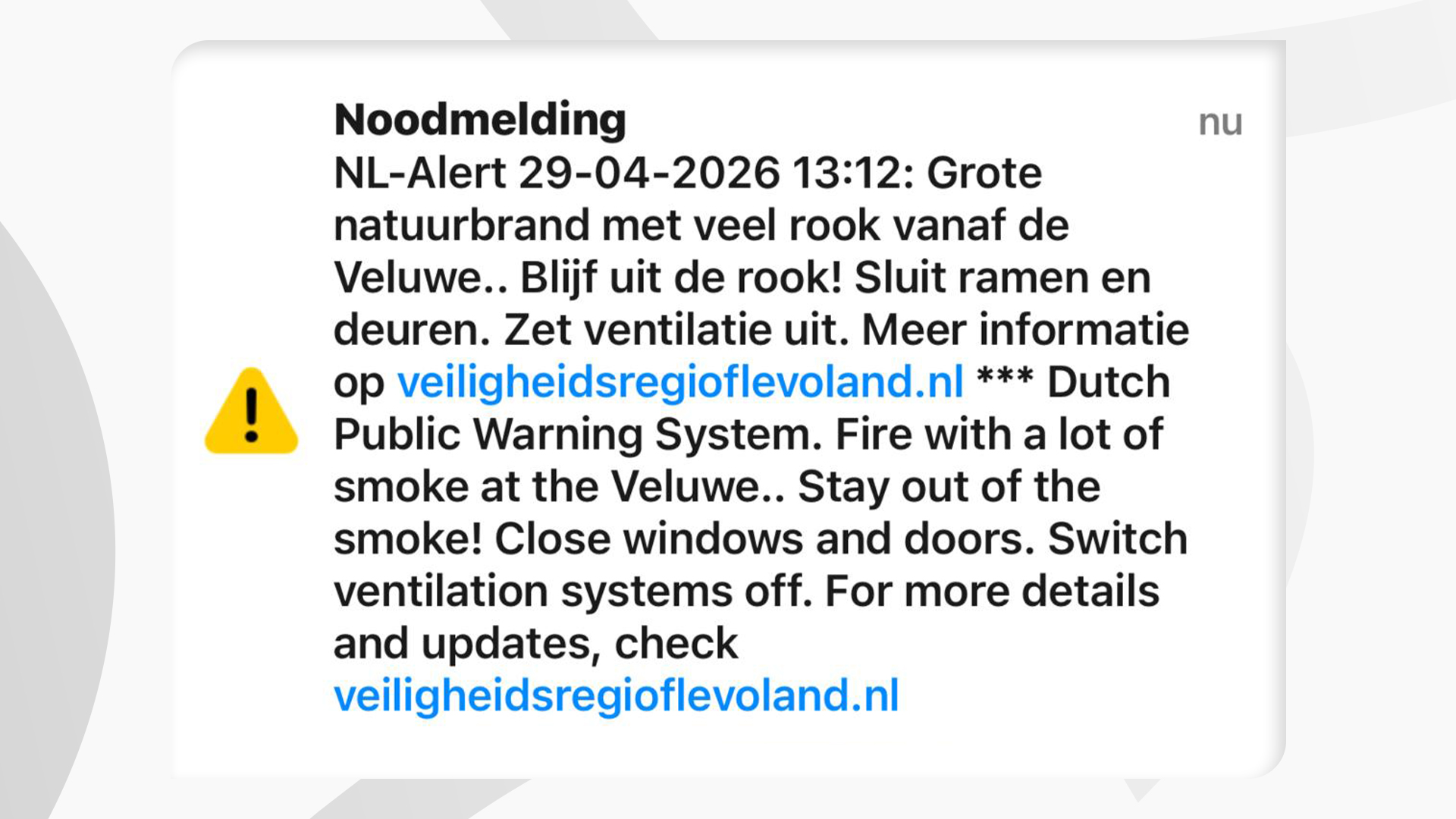 De Veiligheidsregio Flevoland heeft vanwege een grote natuurbrand in Gelderland woensdagmiddag een NL-Alert uit laten gaan. Volgens woordvoerder Geert Jan Veenstra was deze verstuurd omdat de 112-alarmcentrale overbelast werd door telefoontjes over de brand.