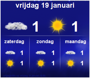 Zaterdag is het eerst bewolkt, maar geleidelijk breekt de zon flink door. De noordenwind is matig, in de open gebieden nu en dan vrij krachtig en het wordt ongeveer 2 graden.