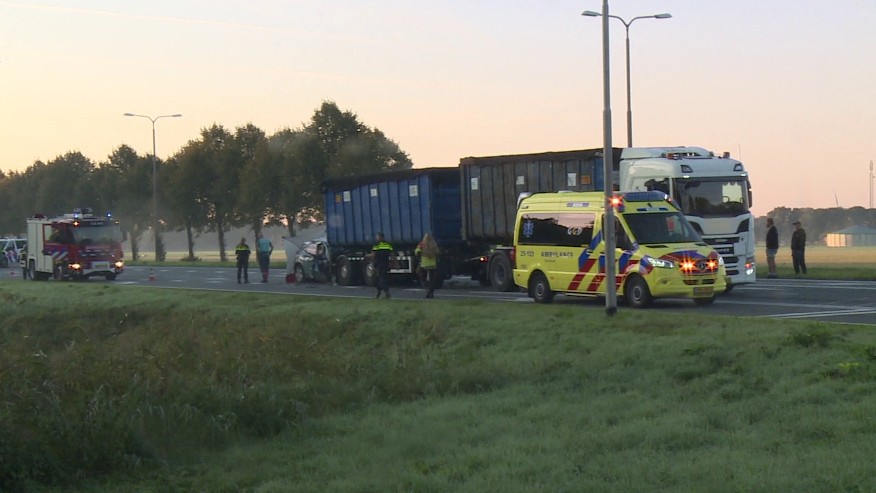 Het ongeluk gebeurde rond 07.45 uur. Een auto is bij een verkeerslicht vol op de achterkant van een vrachtwagen gebotst.