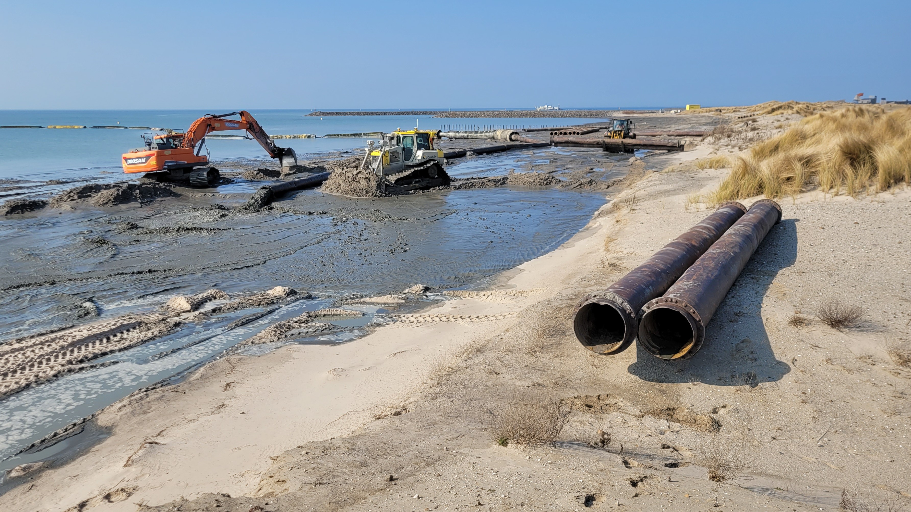 "Via drijvende buizen komt dat hier aan land", zegt Pater. Het slib is naar grote waterplassen op de eilanden gegaan. Die zijn daarmee gedempt. Het slib klinkt nog wat in. "Het vormt straks eilandjes en kreekjes", zegt de boswachter. Dat is precies wat Natuurmonumenten wil. Het aanleggen van nieuwe natuur, met een diversiteit aan planten, kleinere diertjes en vogels.