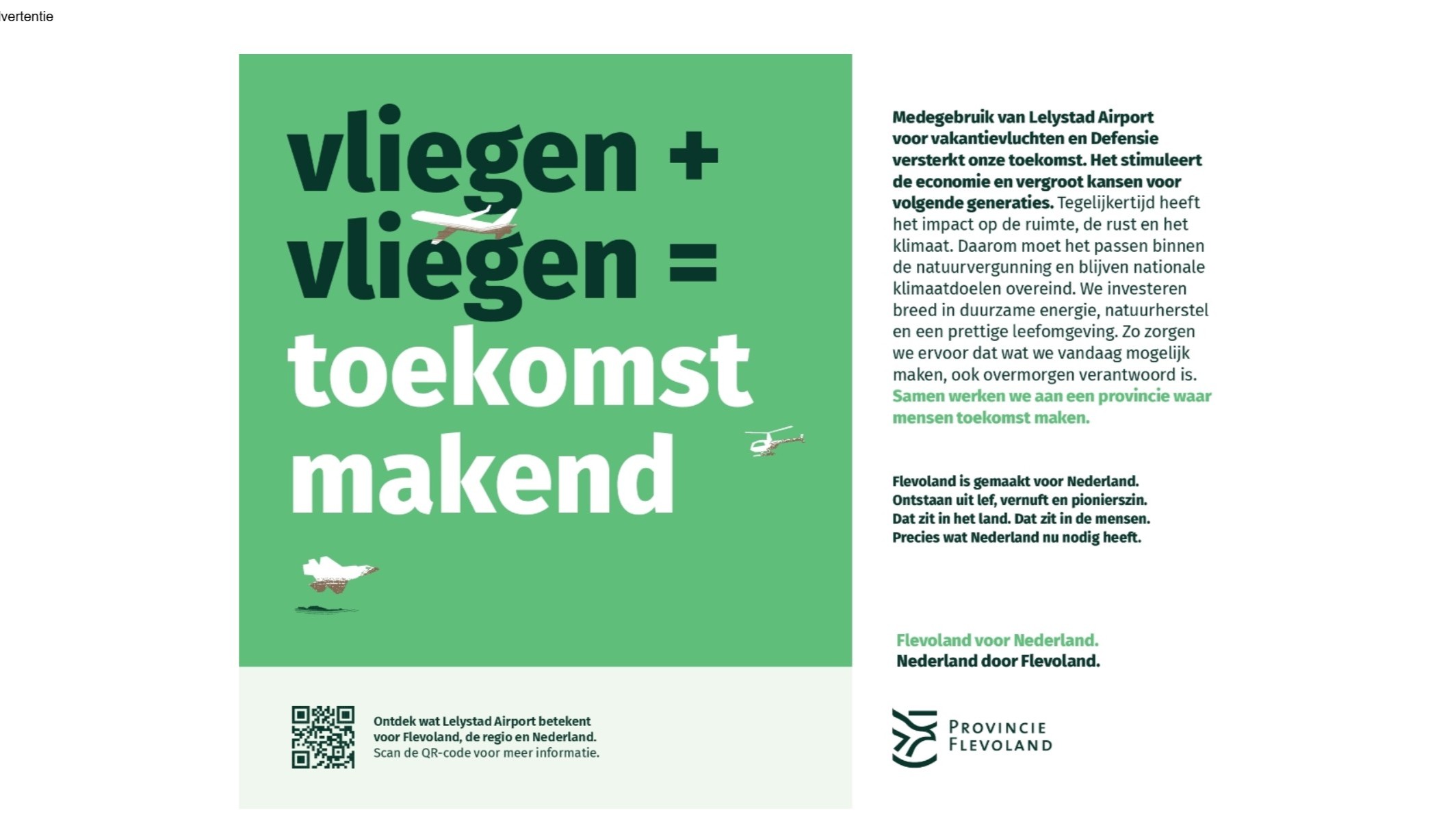 De provincie Flevoland plaatste de advertentie in de lokale krant Zeewolde Actueel. Daarin wordt onder meer gesteld dat met vakantievluchten en Defensie op het vliegveld de toekomst wordt versterkt en de kansen voor volgende generaties wordt vergroot.