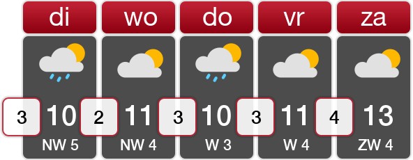 Dinsdag blijft het vaker droog en schijnt de zon van tijd tot tijd. Enkele buien komen echter nog wel verspreid over de provincie voor, maar in de late middag en avond blijft het overal droog. De noordwestenwind waait minder sterk, daardoor voelt het tijdens droge momenten in de zon milder aan.