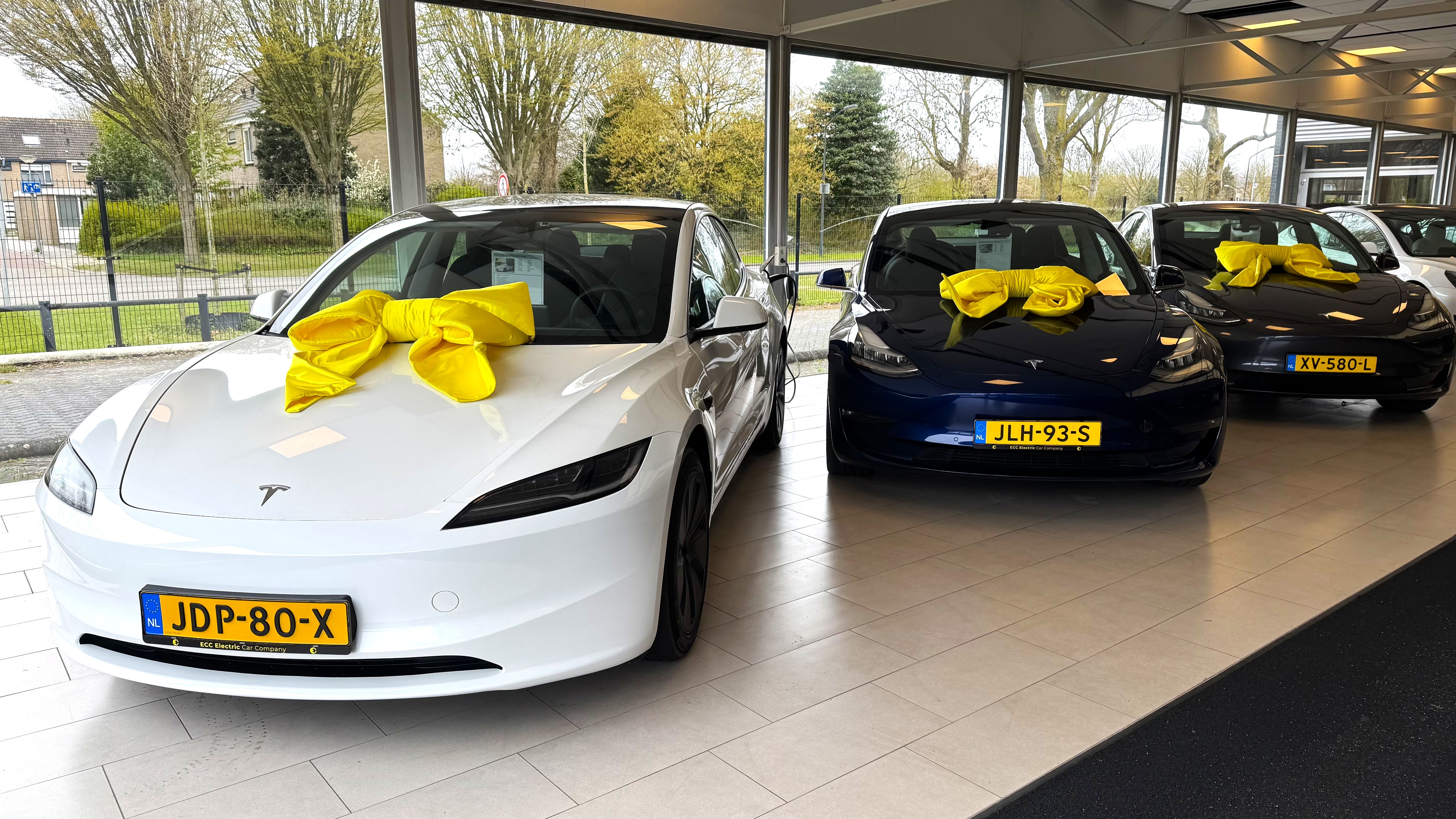 Wat meteen opvalt bij Electric Car Company in Lelystad: bijna overal hangen gele strikken. Meer dan helft van de auto's op het terrein is al verkocht. En zelfs dat is nog niet genoeg. "We komen zelfs strikken tekort", zegt eigenaar Nick van Beeten terwijl hij langs de rijen elektrische auto’s loopt. "Zelfs de auto’s achterin zijn al verkocht."