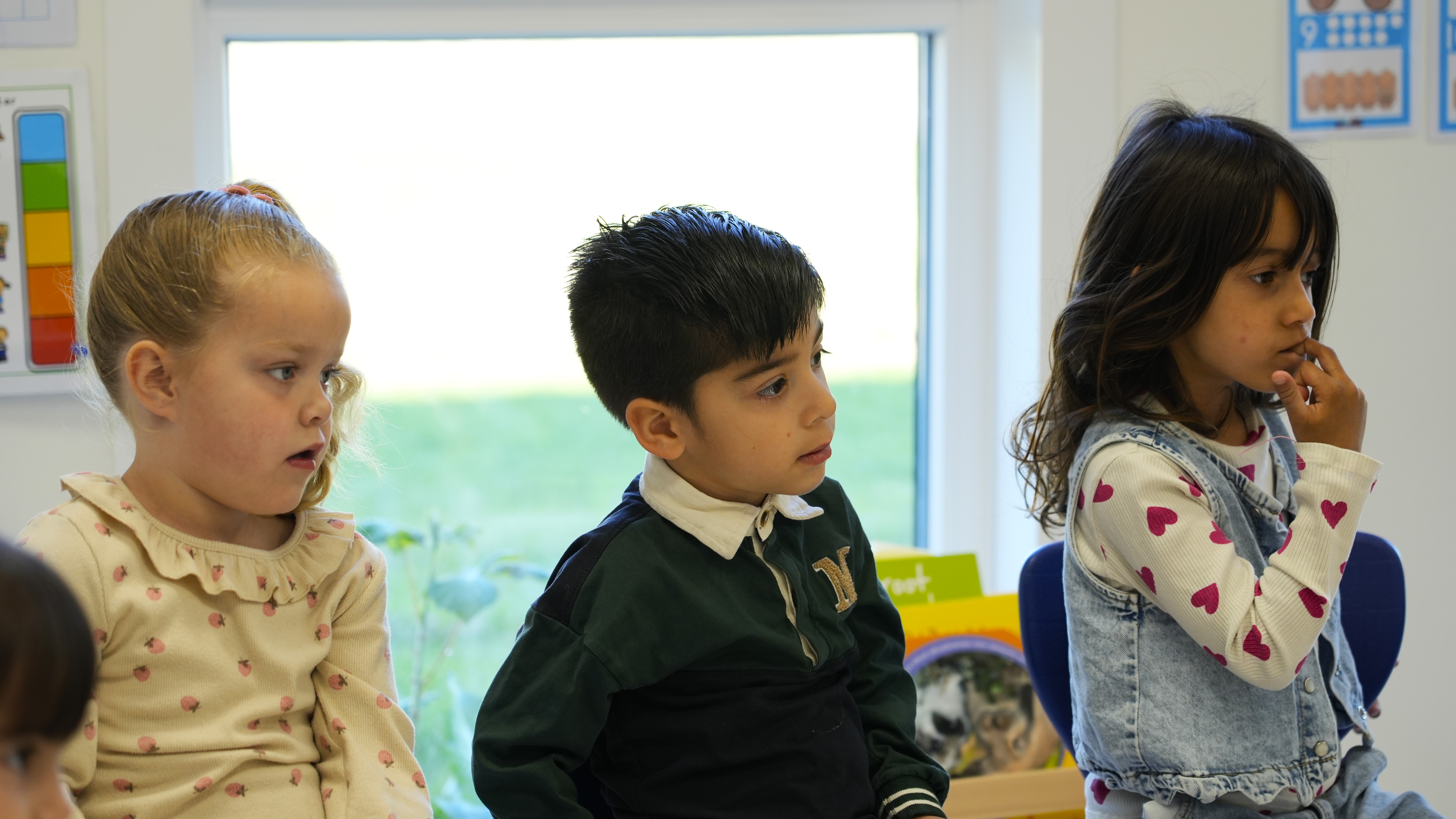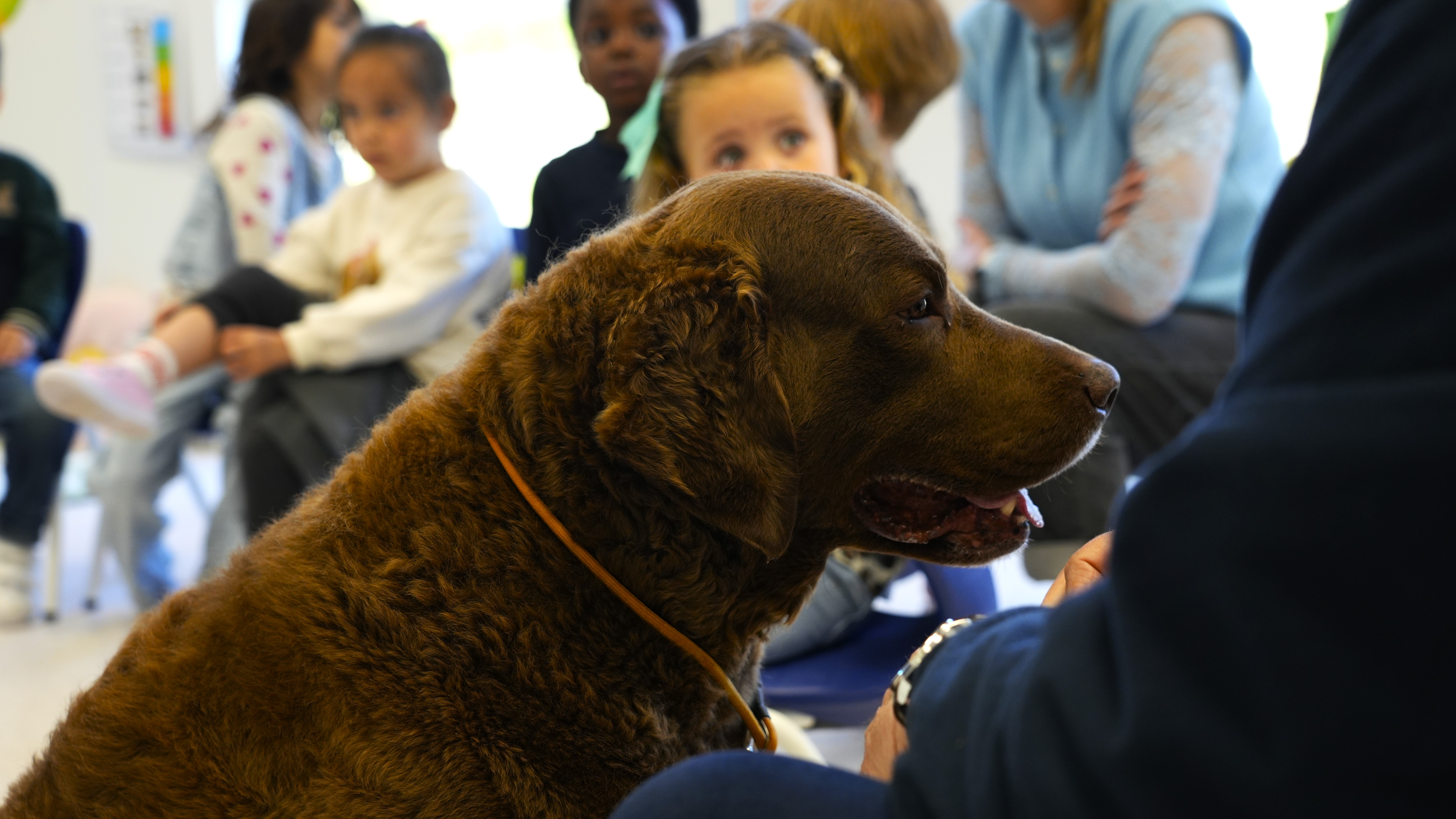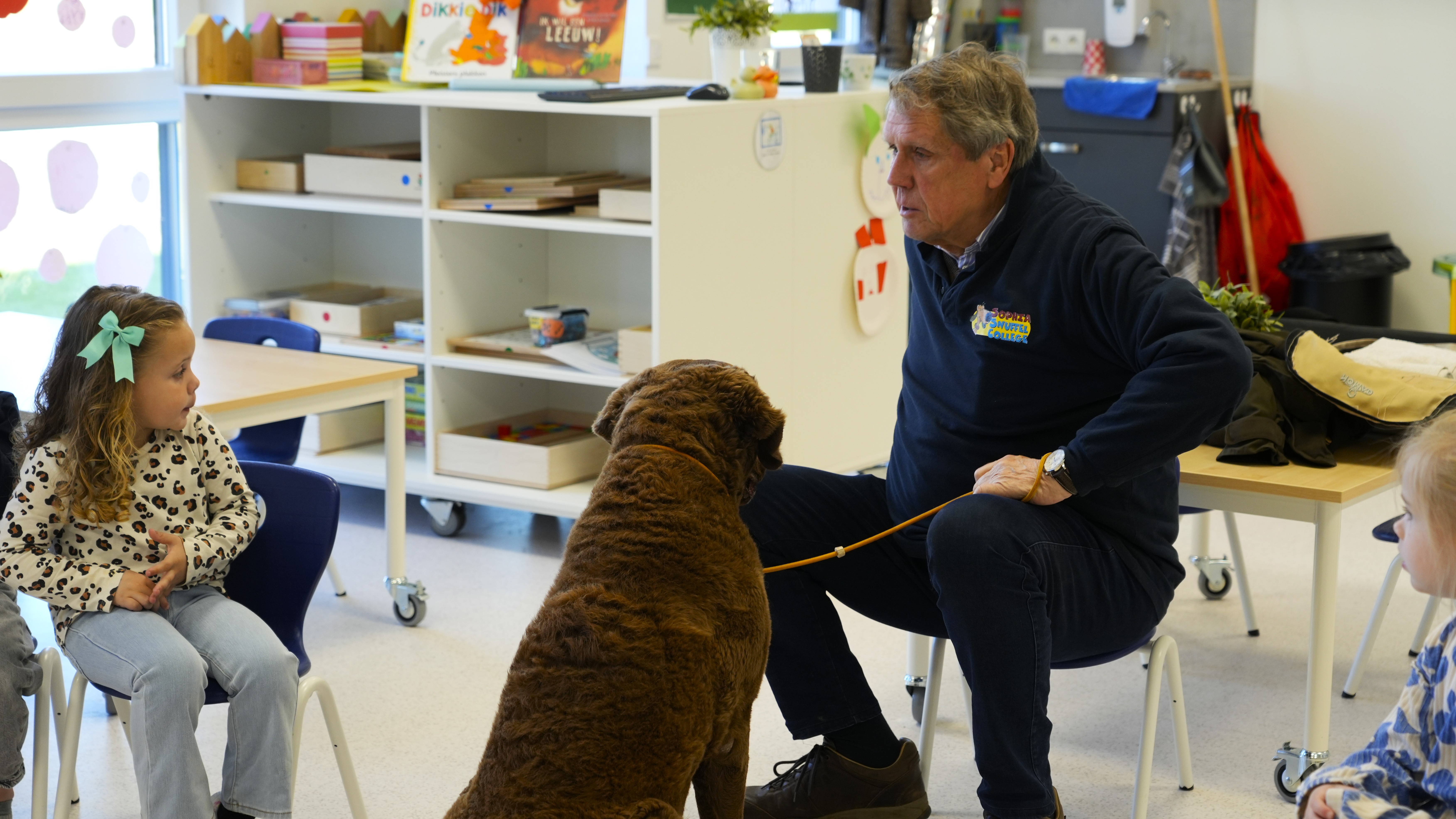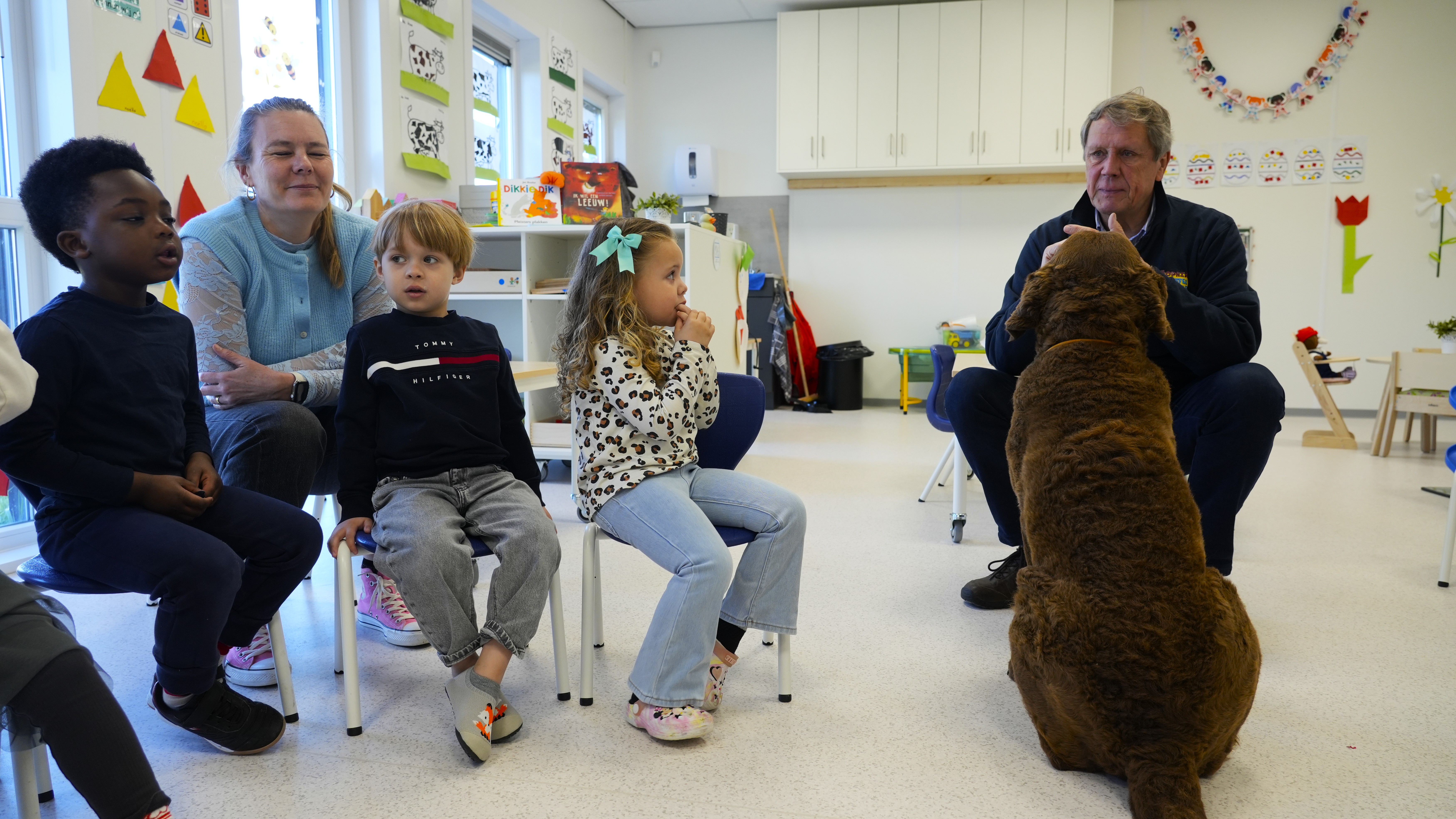 Een kwispelende staart, kleine handjes en hier en daar een beetje spanning: in groep 1 van OBS De Triangel in Lelystad draait het woensdagochtend even niet om letters en cijfers, maar om hondentaal.